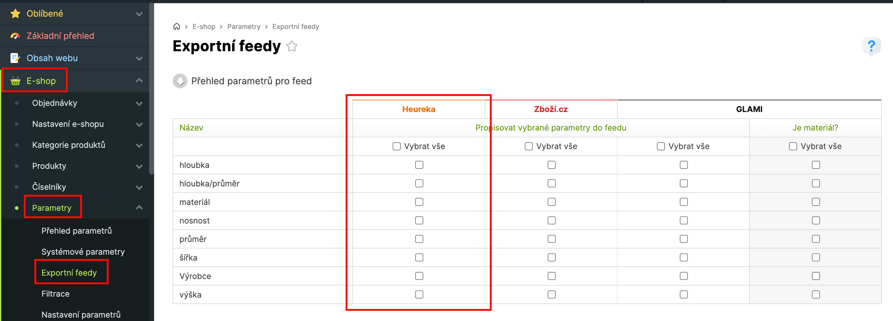 Povolit odesílání parametrů do feedu je snadné. V menu Eshop → Parametry → Exportní feedy. Lze posílat všechny či jen vybrané parametry.