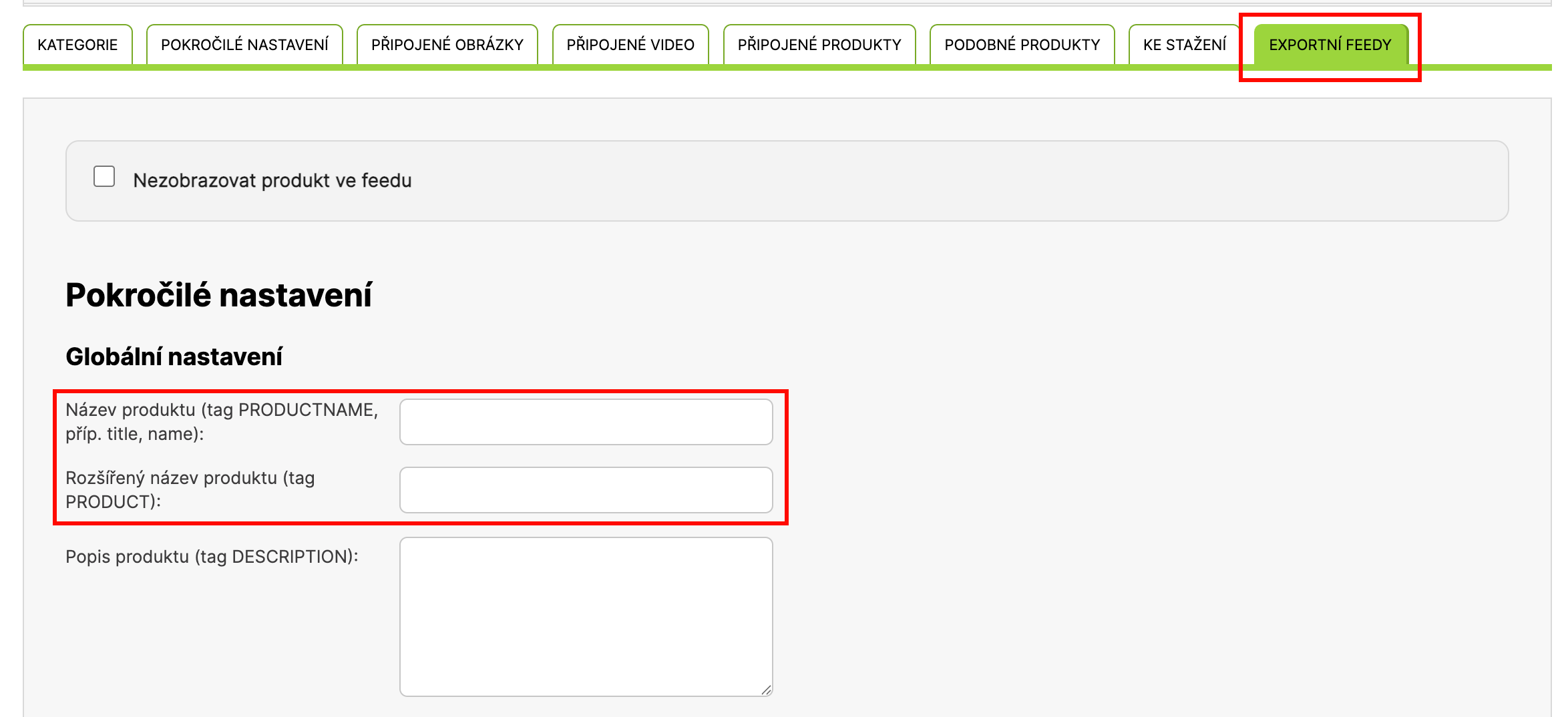 Pokud využíváte nižší tarif Eshop-rychle než Business, máte možnost upravit pouze Globální nastavení. Název produktu z Globálního nastavení se bude přenášet nejen do Heureka XML feedu, ale i do všech ostatních XML feedů z e-shopu.